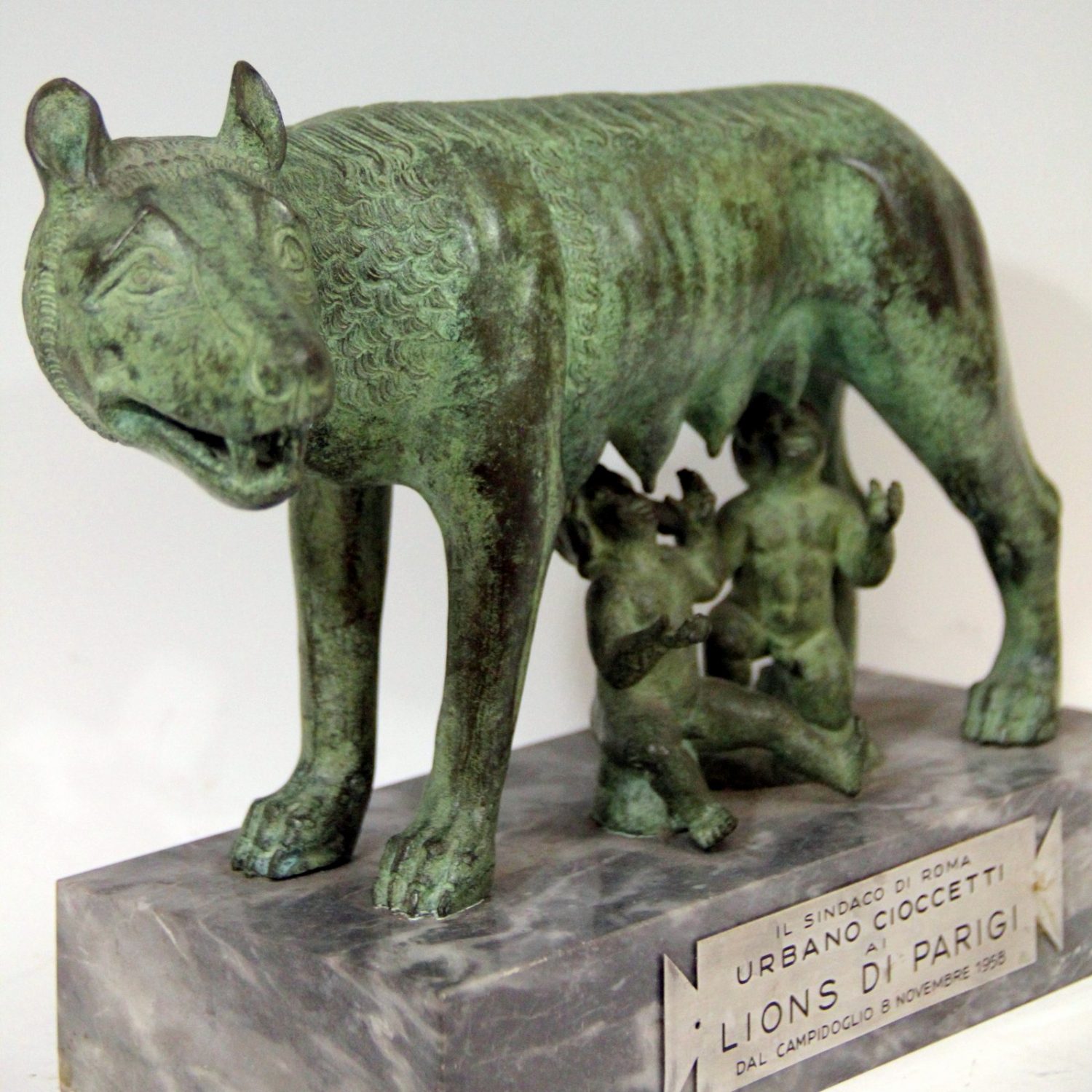 C’est la louve la plus célèbre du Monde… La protectrice et la mère nourricière qui recueillit au pied du mont Palatin les fameux jumeaux Rémus et Romulus, dont le second fondera Rome en 753 avant JC, selon la légende. En 2006, l’examen au carbone 14 a daté du XIIème siècle notre louve emblématique, longtemps considérée comme une statue étrusque. Une composition étonnante, véritable condensé d’époques et de civilisations. Du mythe au Moyen-Âge en passant par la Renaissance, dont les jumeaux reprennent le style réaliste et dodu, tandis que la louve reste hiératique, voire schématique, telle une gargouille médiévale. Hommage d’un peuple et de la Ville éternelle à ses fondateurs, et notamment du maire Urban Cioccetti qui offrit en 1958 au Lions Club de Paris, cette parfaite réplique (en réduction) de l’originale, grandeur nature, du musée du Capitole.